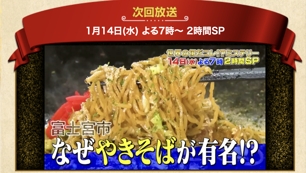 フジテレビ系列「世界のなんだコレ!?ミステリー」1月14日19時オンエア おしらせ 2026.01.13 2026年1月14日(水)19時 フジテレビ系列「世界のなんだコレ!?ミステリー」の2時間スペシャルの中で、「言われてみたら気になる御当地のなぞ」のコーナーで富士宮やきそば誕生ヒストリーが紹介されます。ぜひご覧ください。